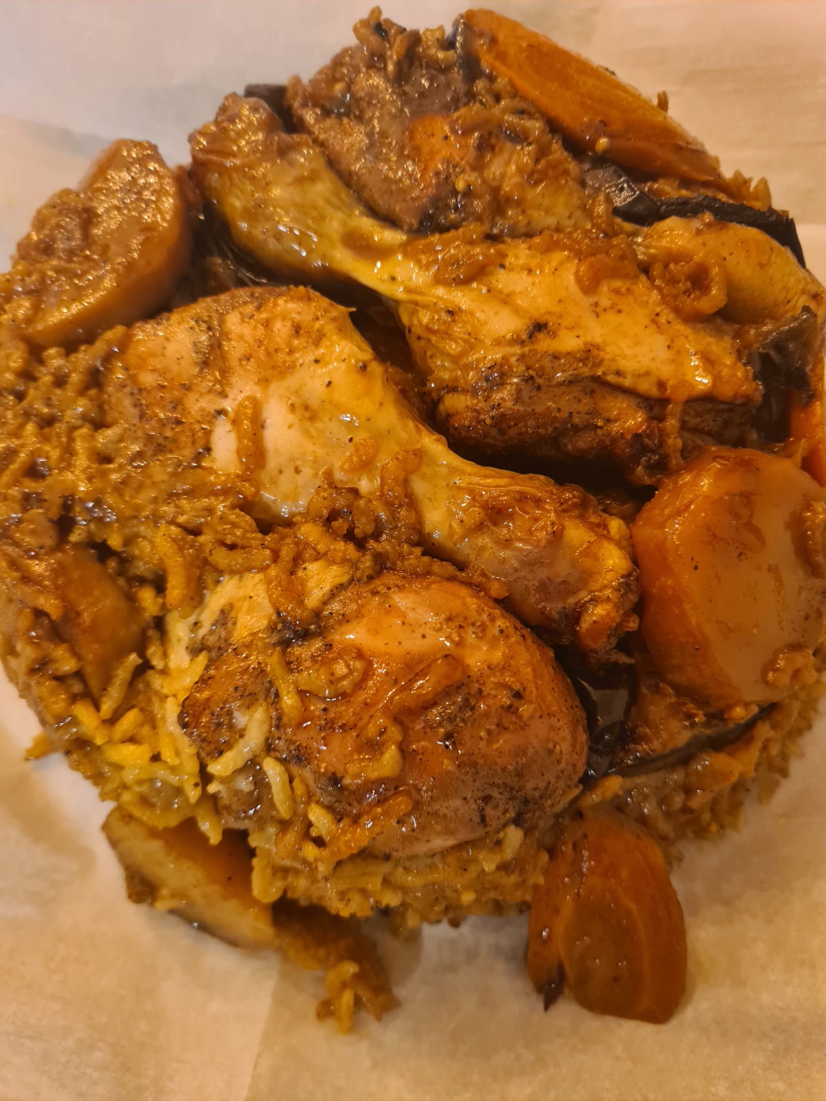 מקלובה- תבשיל עוף אורז מאודה וירקות מטוגנים בניחוח בהרט