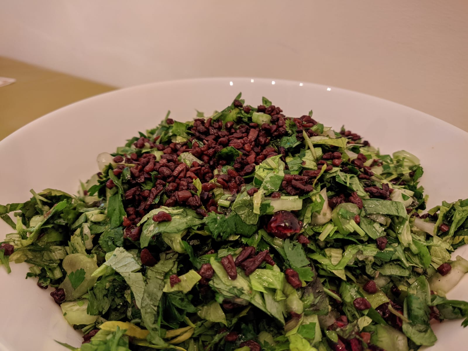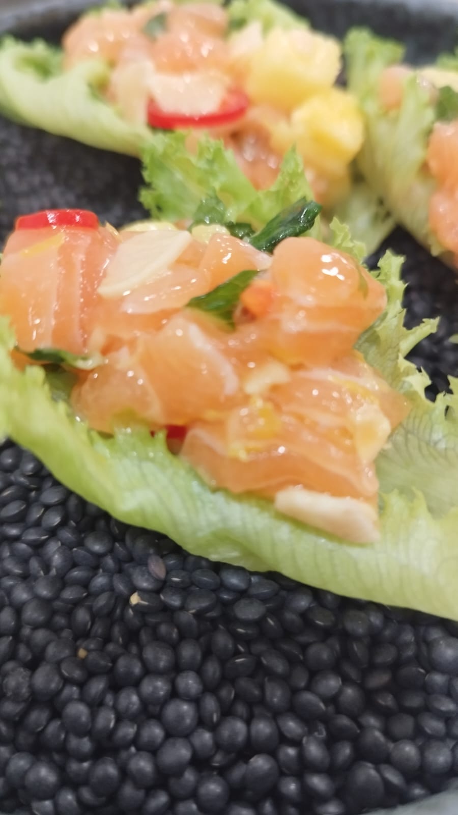 סלמון מעושן/גרוולקס על מצע גבינה טבעונית וצנים קדאיף