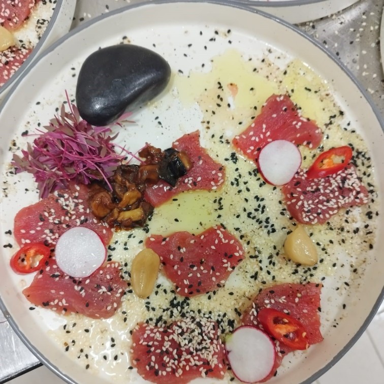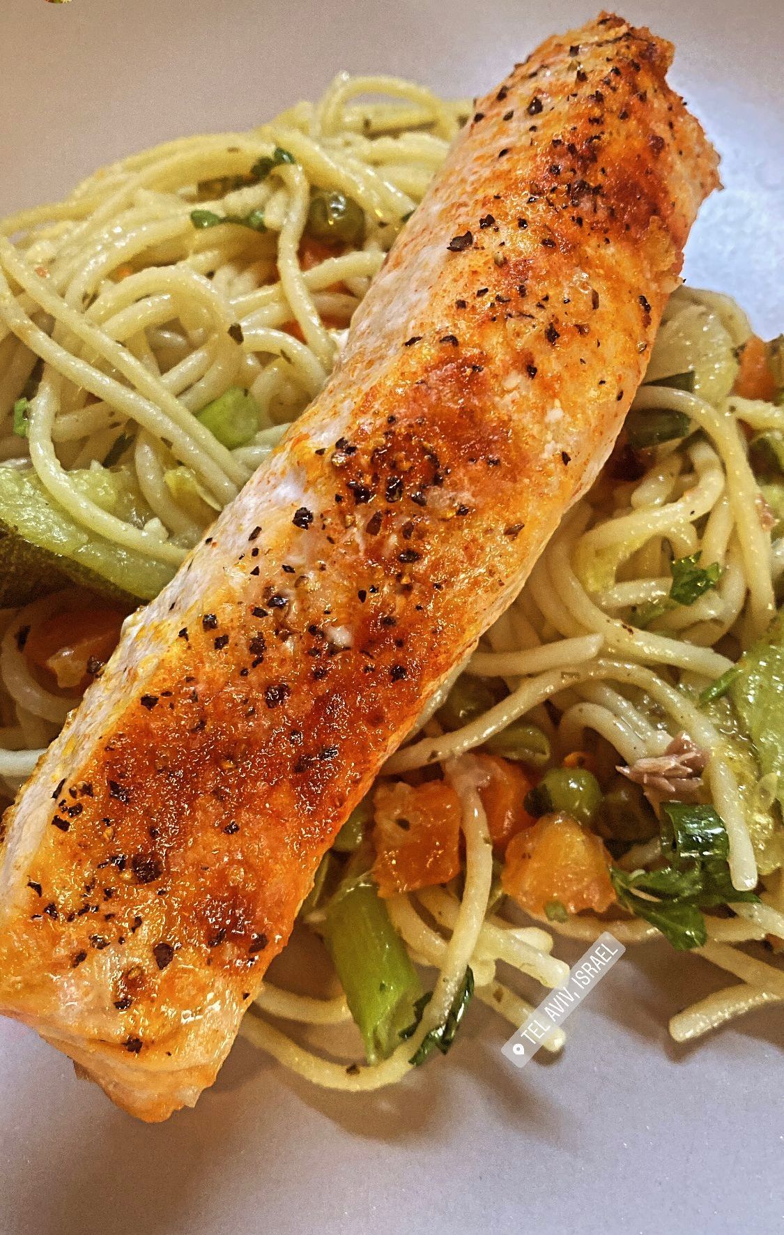 פילה טונה ברוטב מזרחי עם פלפלים עגבניות וגרגירי חומוס