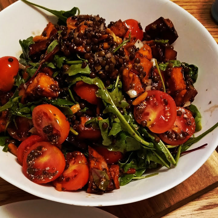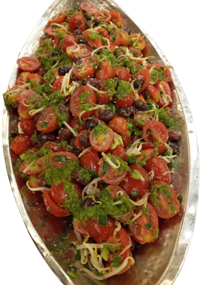 סלט עגבניות שרי זיתי קלמטה ובזיליקום ירוק שום והמון אהבה