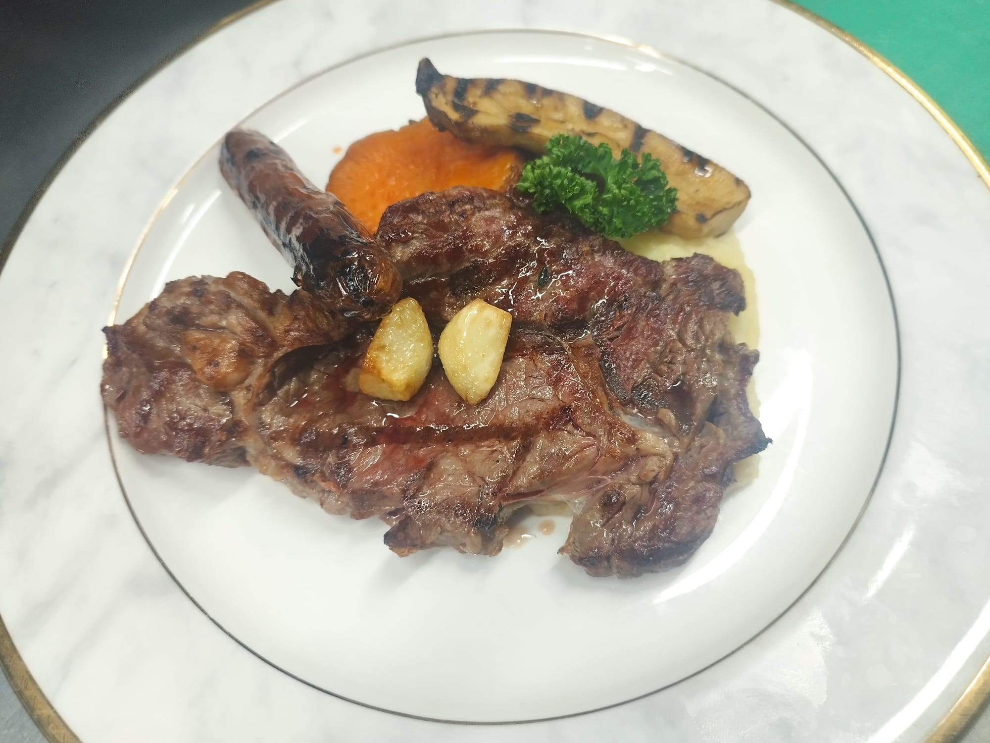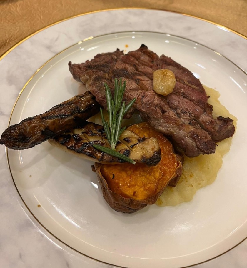 סטיק אנטריקוט מיושן בגריל על מצע פירה בטטה וקונפי שום