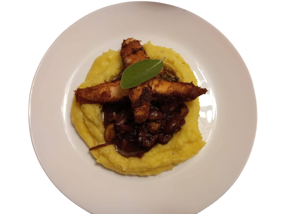 פילה סלמון על מצע פולנטה ופטריות מוקפצות ביין אדום